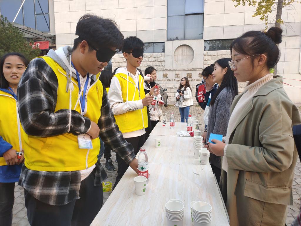 残障体验区,同学们佩戴眼罩,体验穿衣、倒水,在黑暗中摸索着前行,感受残障人士生活的不易。音乐学院王安琪说:“通过这次体验,我感受到了作为一位残障人士的艰辛,懂得了尊重与平等才是与他们相处的最佳方式,而人生有许多的挫折坎坷,要用积极乐观的心态面对生活。”