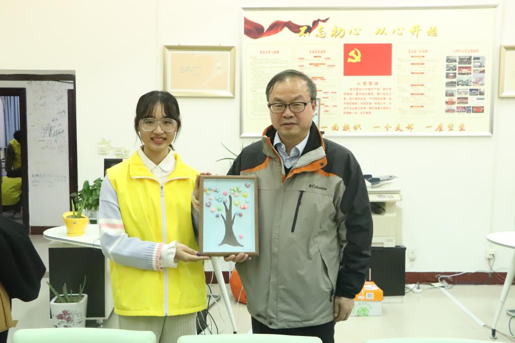首先,心联同学详细介绍了心理中心的预约流程,在团体辅导室,俞亚东观看了我校心理健康运动会、心理健康文化节等特色活动视频,并对我校特色品牌活动给予了极大的肯定。王宝玲主任介绍了我校心理中心的日常工作内容并分享近期工作成果。心理中心老师展示了我校心理中心举办的“秋冬心事”活动的部分手工作品,心联同学送上亲手制作的星星画并合影留念,记录美好瞬间。